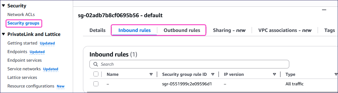 From the Your VPCs page, select Security groups from the Security section.