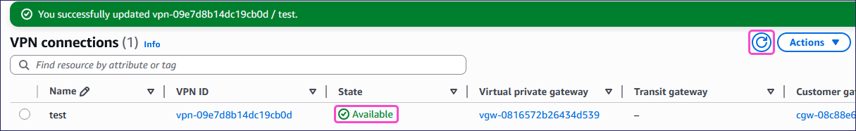 Select Retry. AWS updates the VPN State to Available: