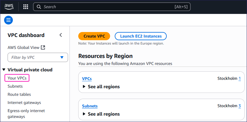 From the left pane, select Your VPCs from the Virtual private cloud section: