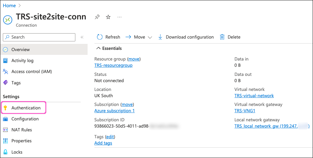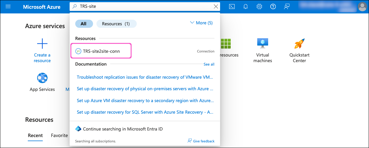 In the search field, locate and select the site-to-site connection resource configured as part of the virtual network gateway (the value you specified in the Name field during this step):