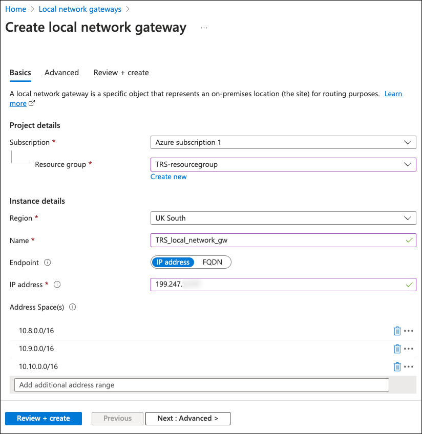 Local network gateway: Select the gateway you created as a part of Creating a local network gateway.