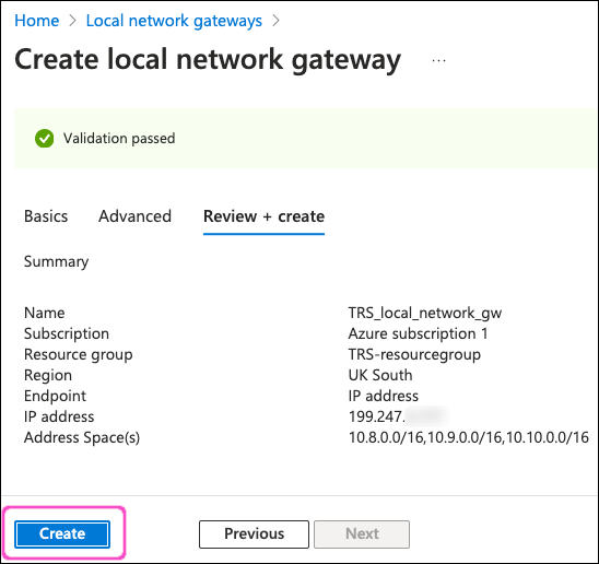 Review your local network gateway settings, then select Create: