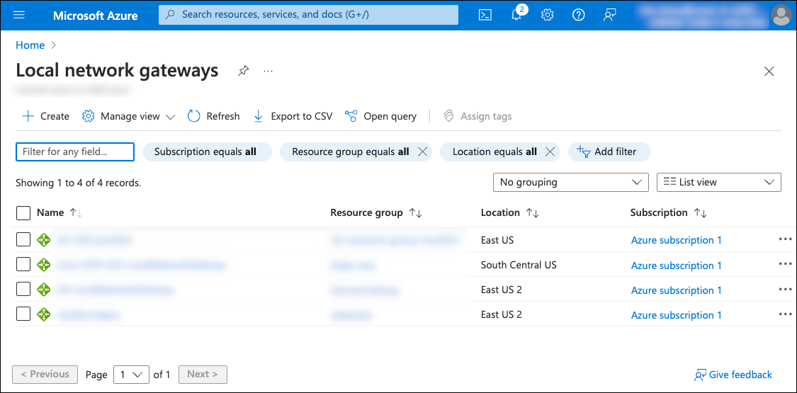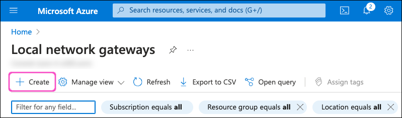 Select Local network gateways from the search results to view the Local network gateways list: