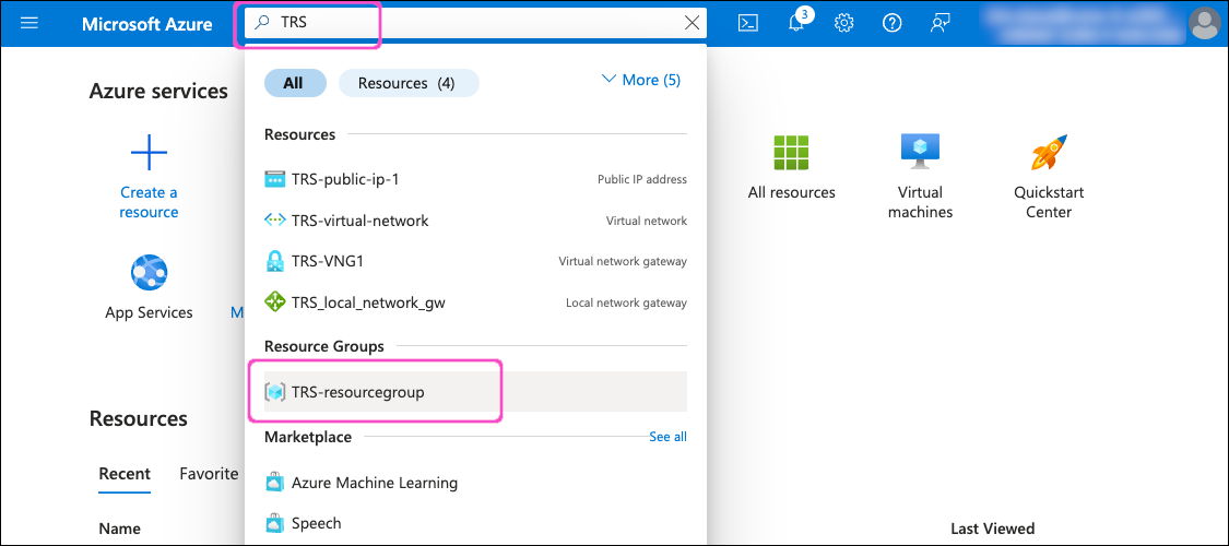 In the search field, enter the first few letters of the resource group you used in the previous sections. Azure displays the results in the dropdown list: