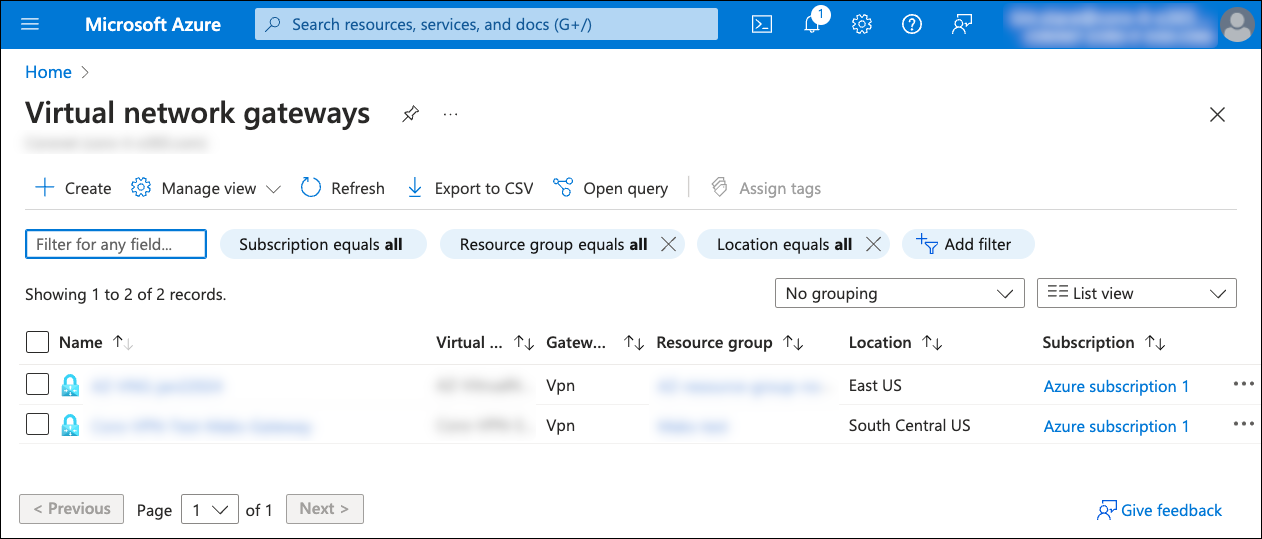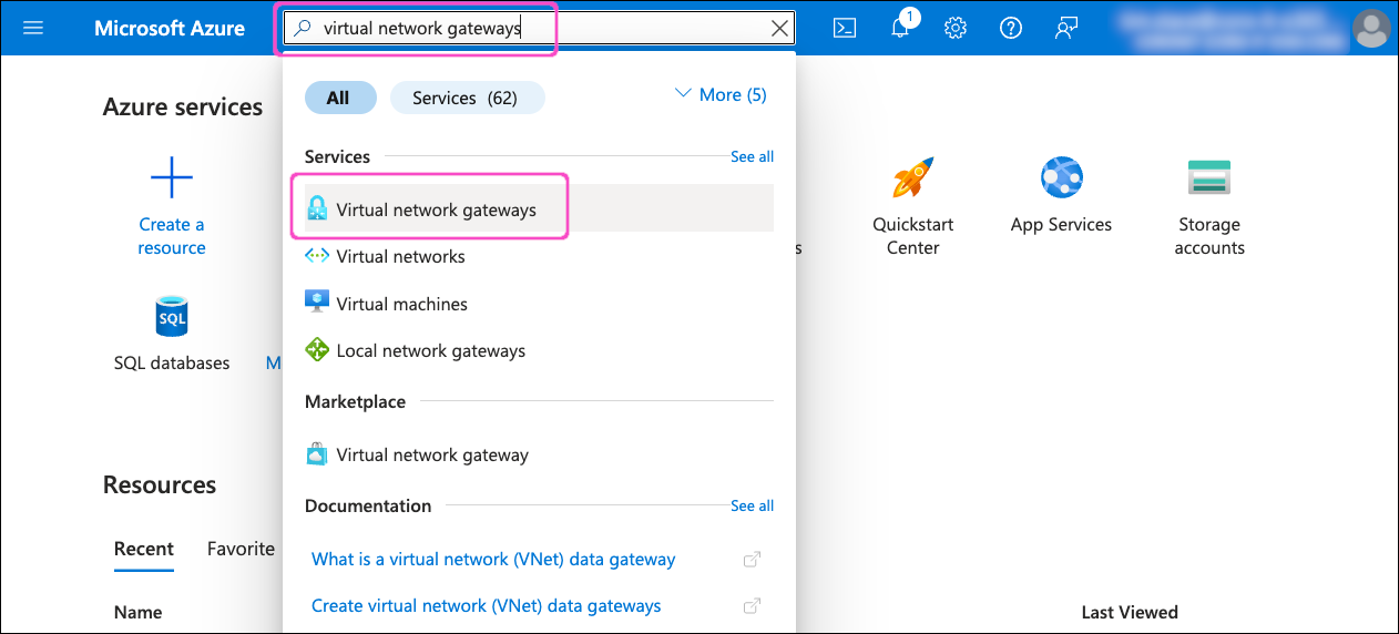 Select Virtual network gateways from the search results to view the Virtual network gateways list:
