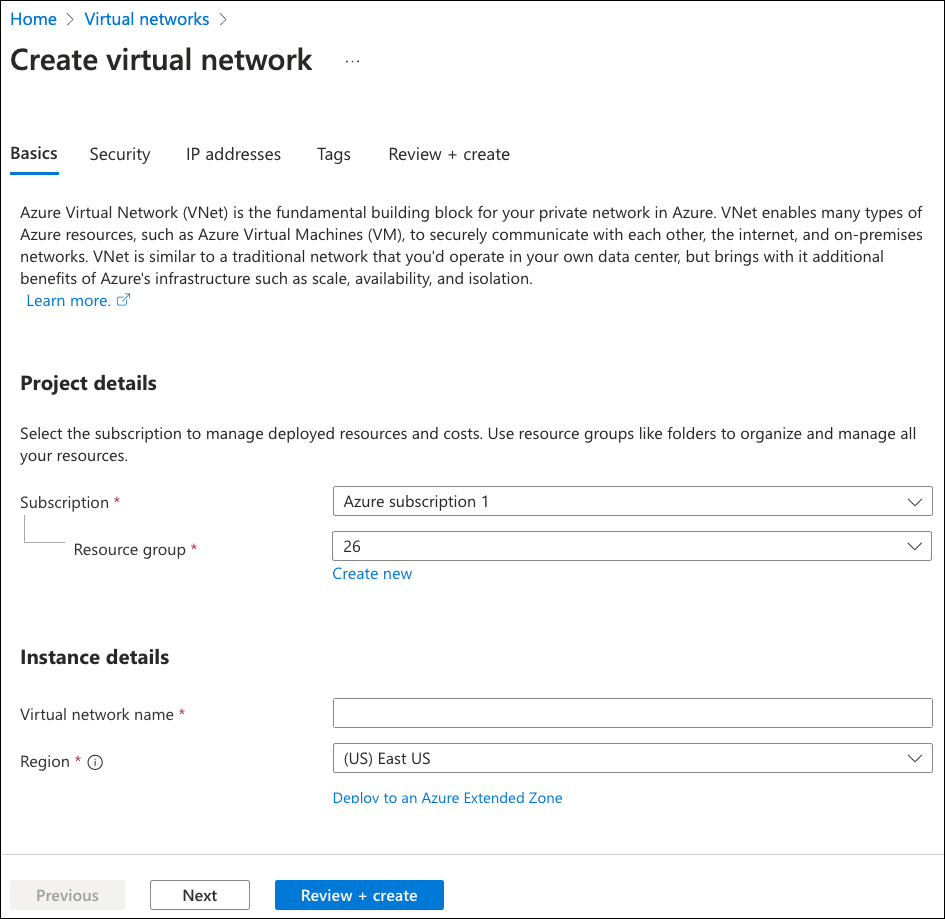 - Region: Select the region into which this virtual network is added.