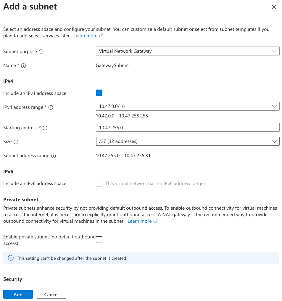 - Subnet purpose: Select "Virtual Network Gateway".