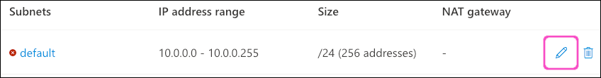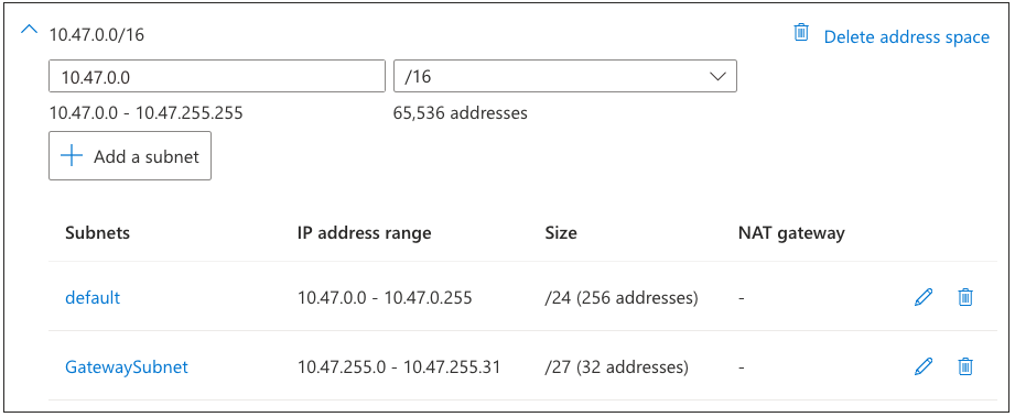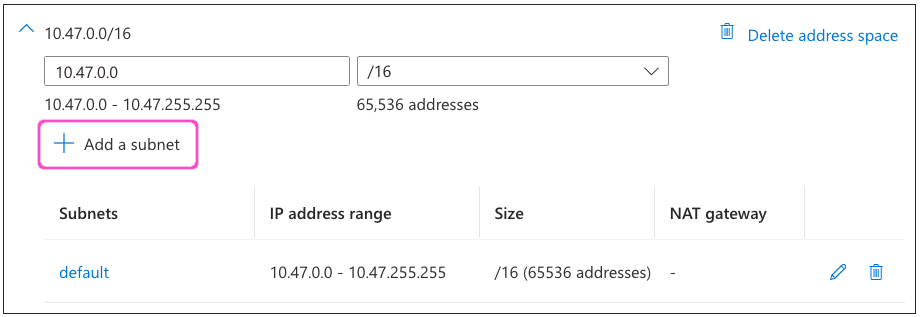 ImportantIn this example, Azure warns that the address range specified (10.47.0.0/16) is not within the default subnet address space for the virtual network (10.0.0.0/24). If you see this message, update the "default" subnet by selecting the adjacent edit link: