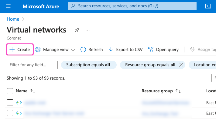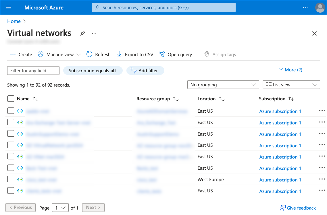Select Virtual networks from the search results to view the Virtual networks list: