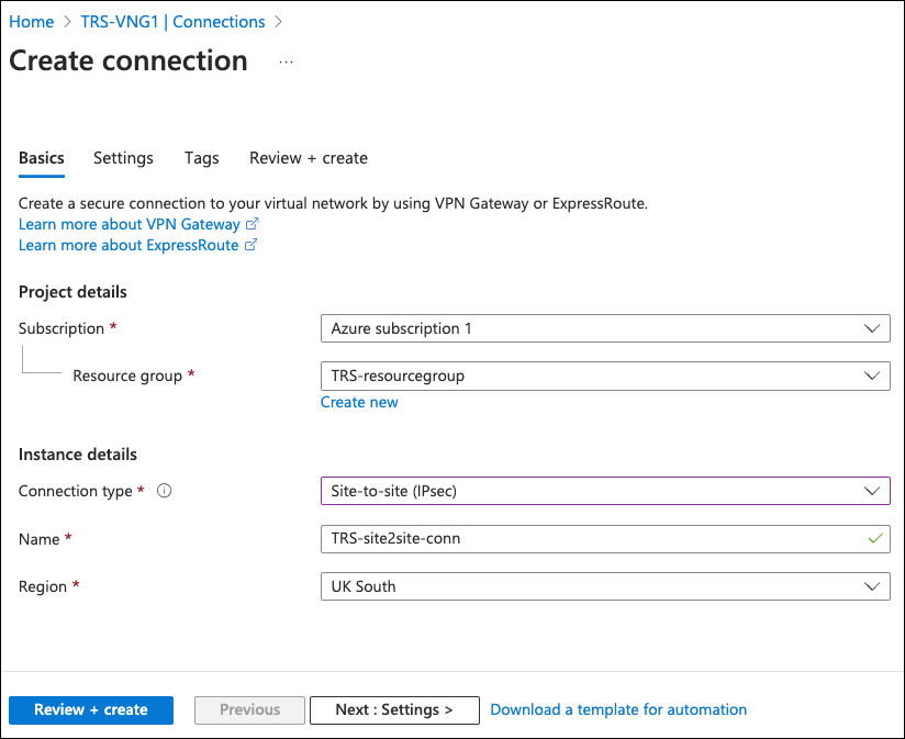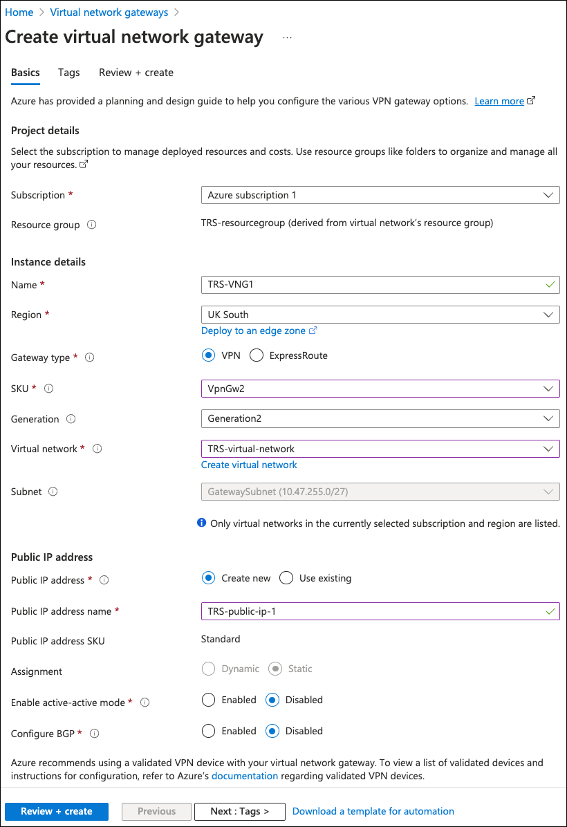 - Resource group: Use the pre-selected resource group associated with this virtual network gateway.