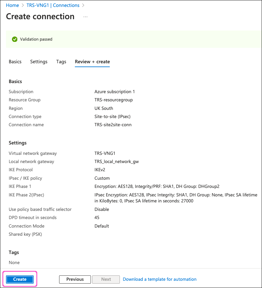 - Preshared key: Enter the shared key configured in Azure.