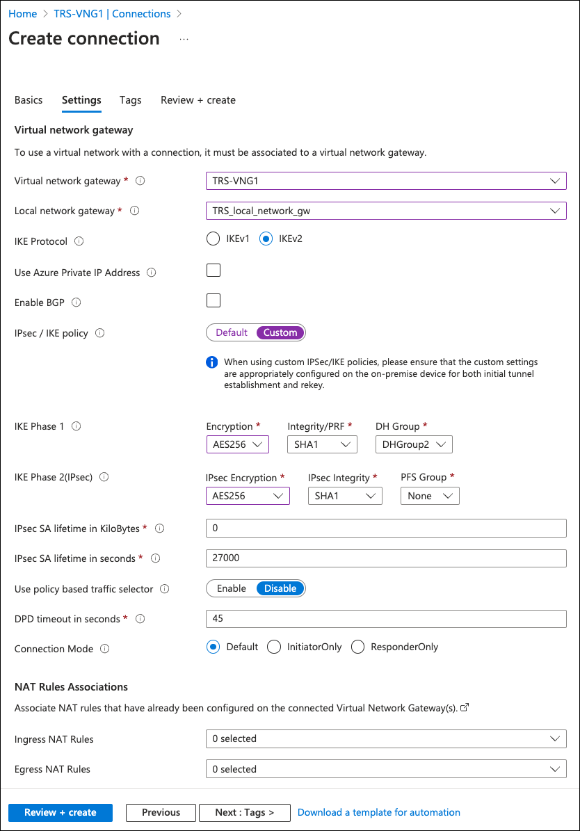 - Lifetime key: Enter the shared key lifetime value configured in Azure.