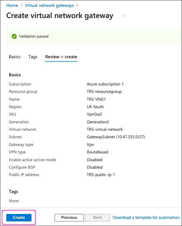 Review your virtual network gateway settings, then select Create: