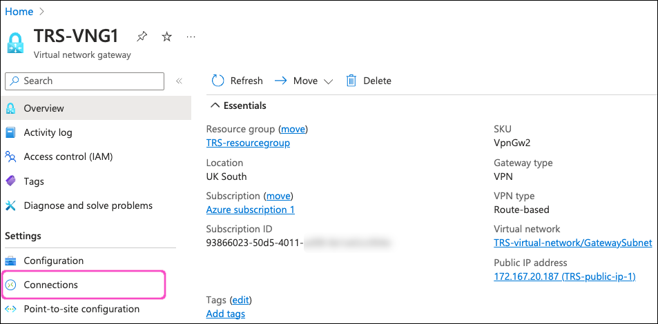 On the virtual network gateway configuration page, select Connections from the left-hand menu: