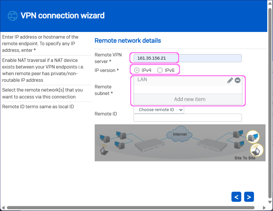 - Remote network IP: Enter the private IP address range used at the remote site.