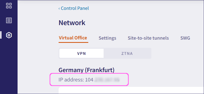 Make a note of your virtual office IP address for configuring your Sophos firewall. Locate the IP address displayed at the top of the Virtual Office tab: