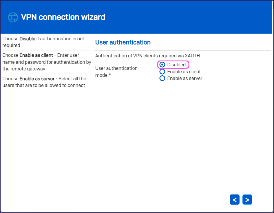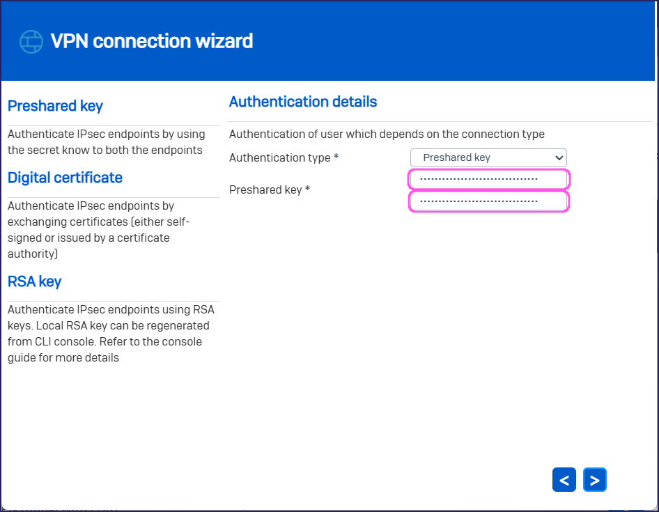 - Preshared key: Enter a shared password (secret) that both sites use to authenticate and secure the tunnel. Use a minimum of 20 characters, and keep a note of the key for configuration on the Sophos device.