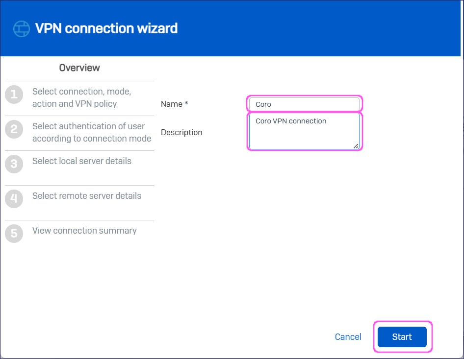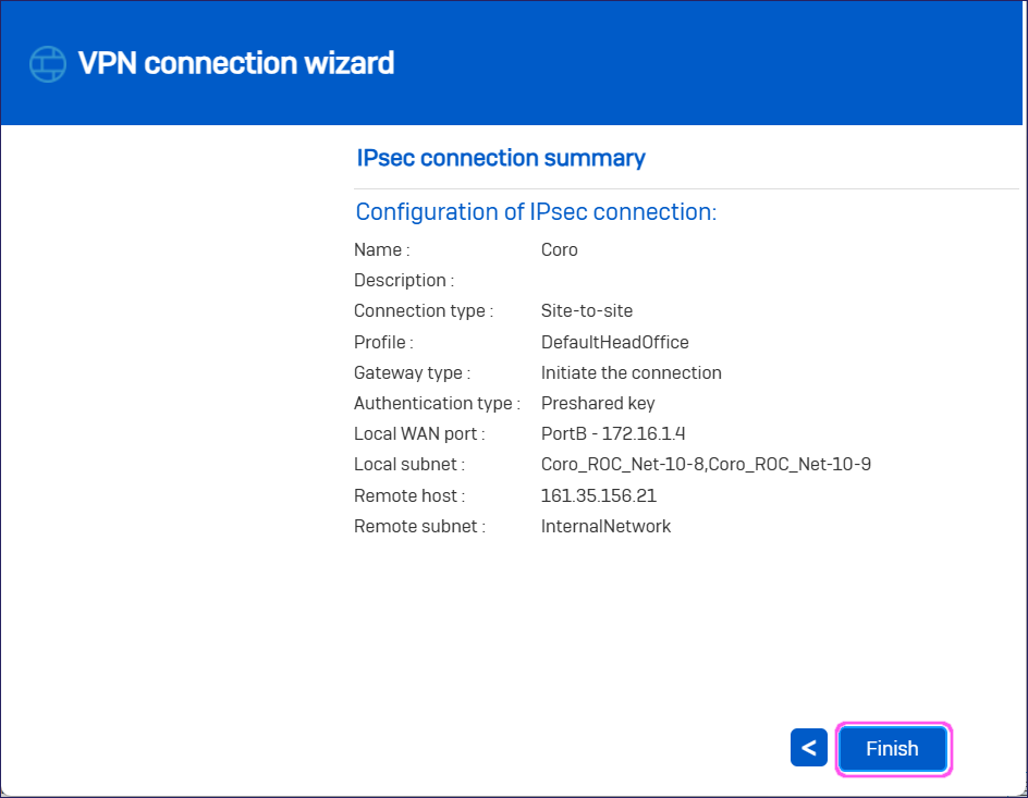Preshared key: Enter the preshared key you set in the Coro site-to site configuration, and then confirm the preshared key: