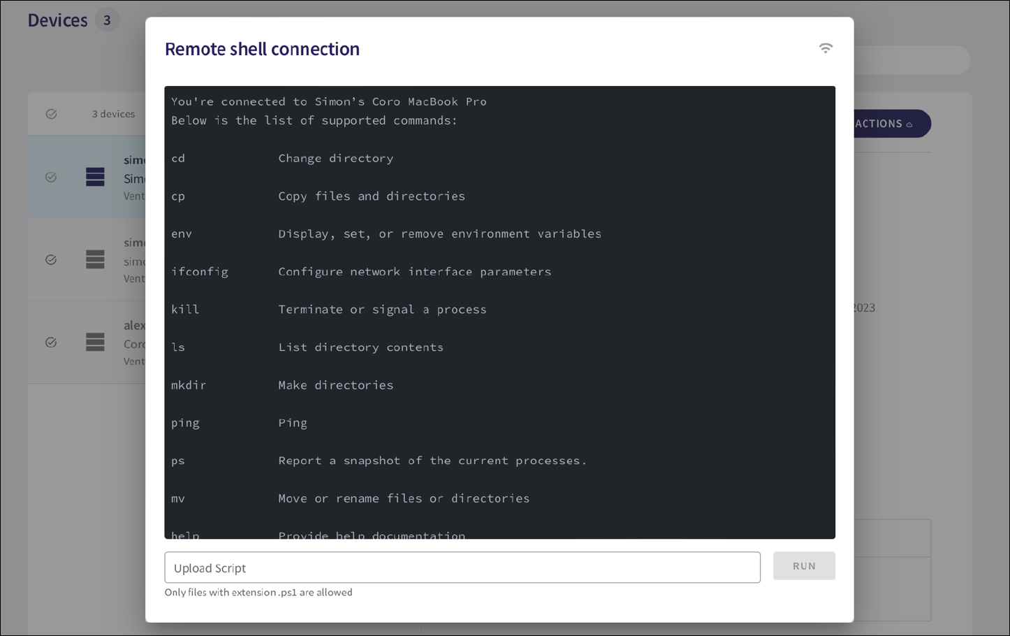 Coro includes a remote shell capability that allows admin users with sufficient permissions to access remote endpoint devices in the event that a compromised device must be isolated from the network. Through the shell, you can execute commands on the device to investigate the cause of an issue in a secure and segregated environment.