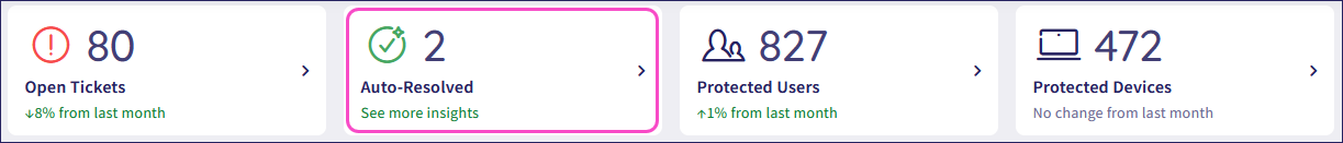 Track how many tickets Coro resolved automatically across active modules, including a trend indicator.