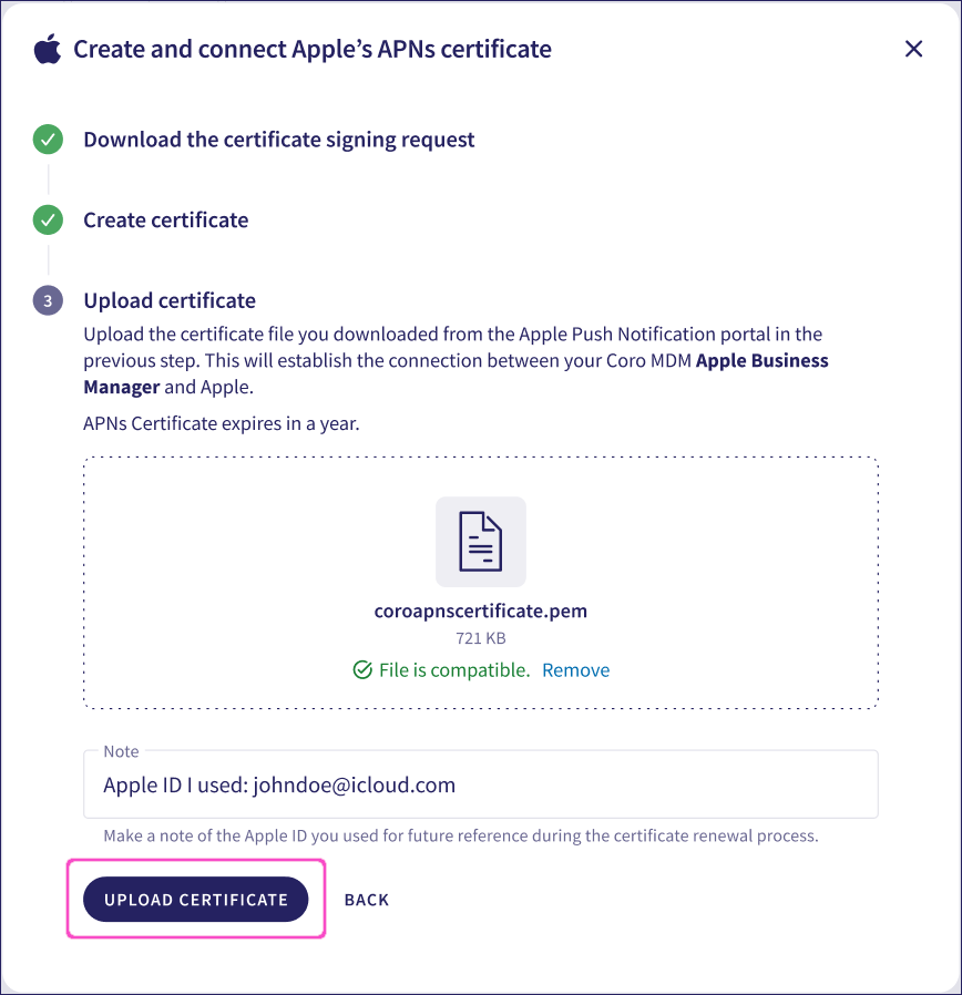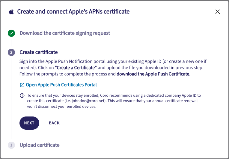 In step 3, use the Upload certificate box to upload the generated APNs certificate to Coro: