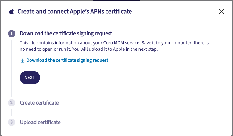 The following procedure describes how to obtain a new APNs certificate. First, download a Certificate Signing Request (CSR) from Coro. Then, use the CSR to request an APNs certificate from the Apple Push Certificates portal. Finally, you upload the generated certificate back to your Coro workspace.