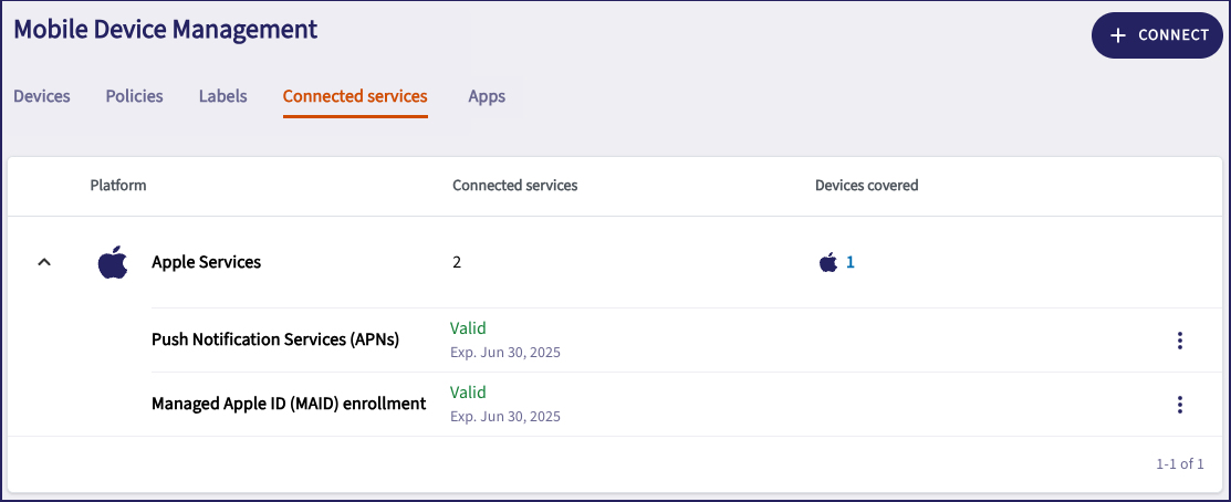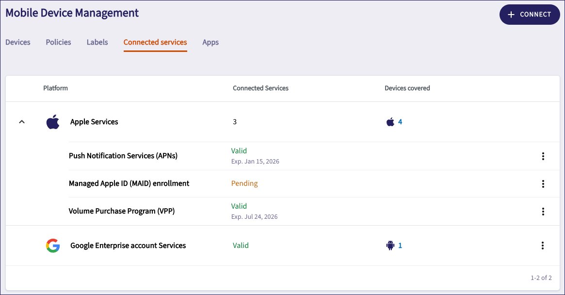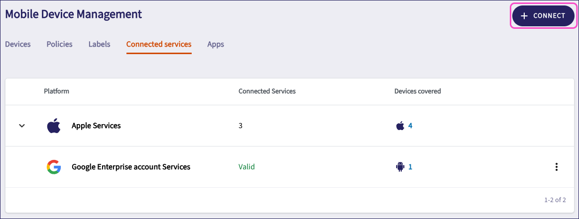If you have yet to configure any MDM services, no page options or tabs are available. Select CONNECT SERVICES to get started.