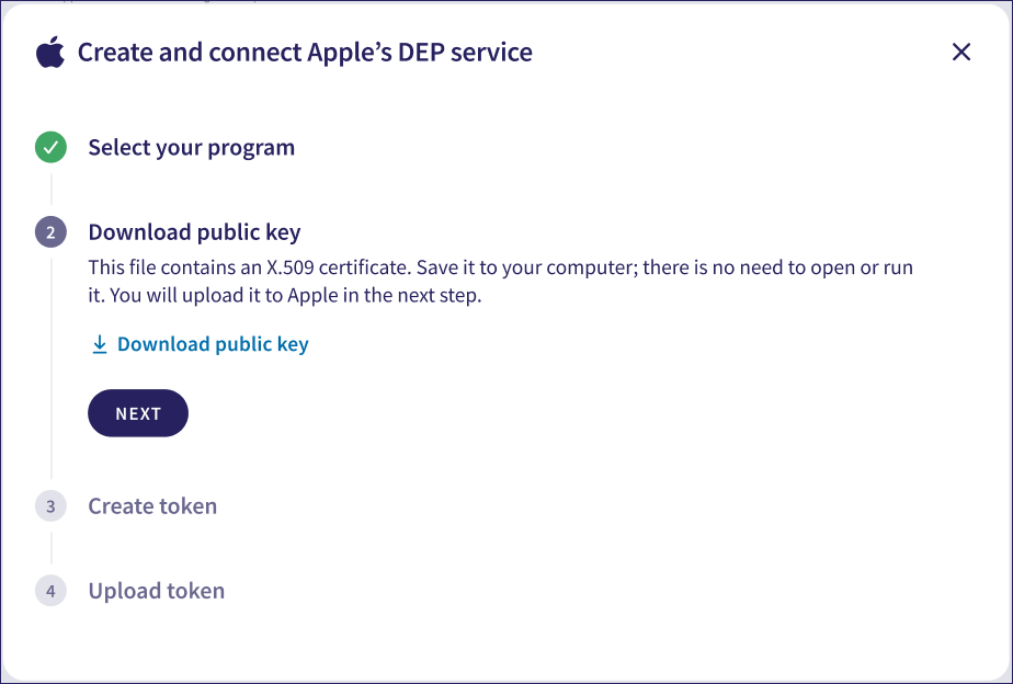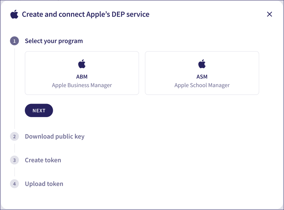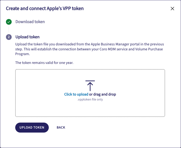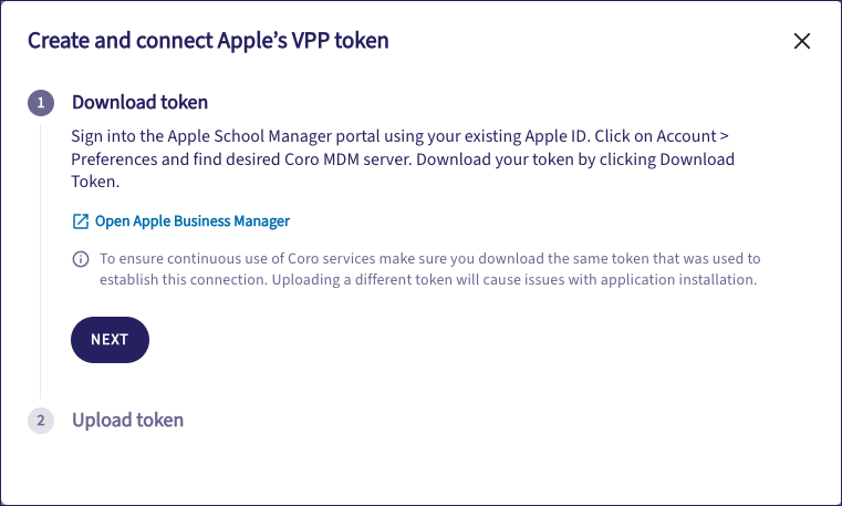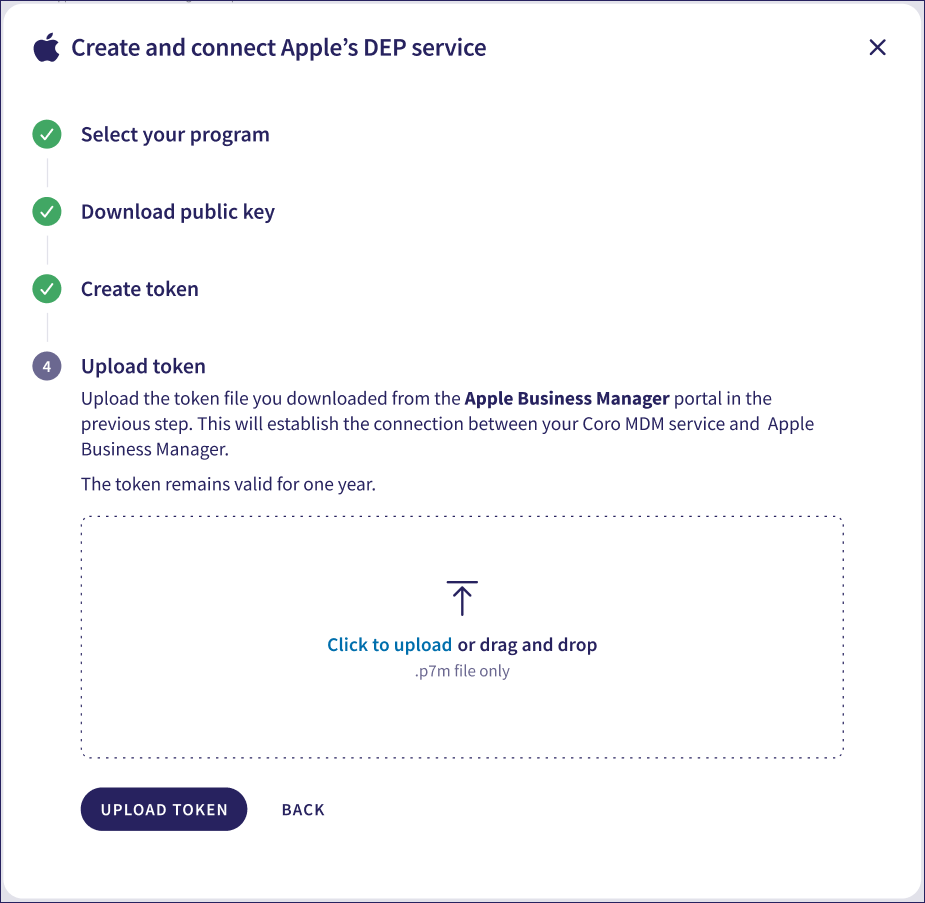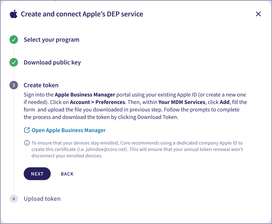 In both cases, before you can designate Coro as an MDM service for devices in the program, you must set up a valid connection between Coro MDM and the selected DEP. This process requires you to obtain a public key from Coro, upload it to your ABM or ASM account, generate a token file, and upload this token back to Coro. This establishes the secure connection required to enable Coro as an MDM option in your Apple DEP console.