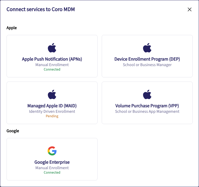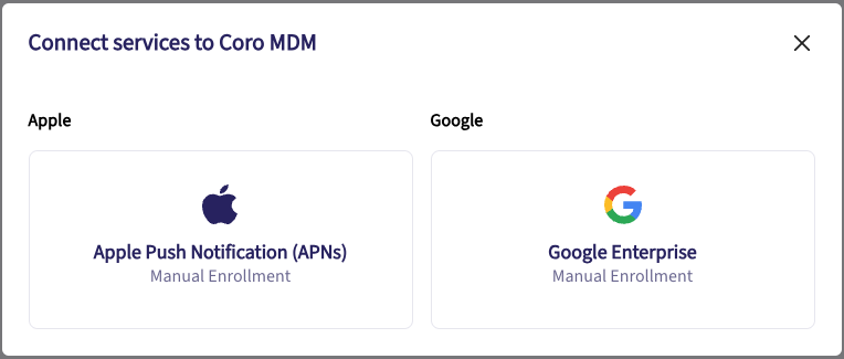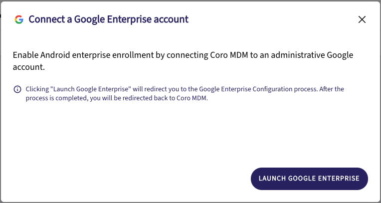 For Android devices, Google requires you to connect a Customer Managed Google Enterprise account to your Coro workspace.