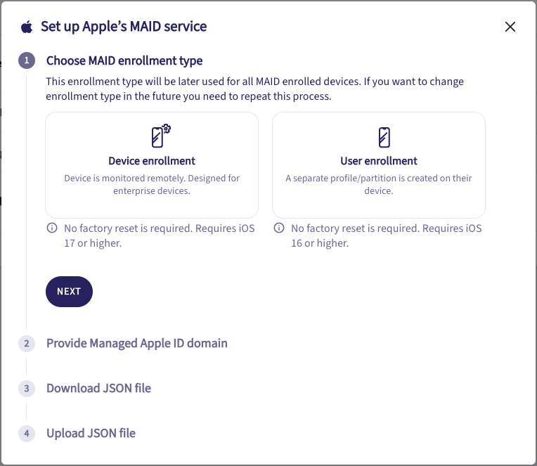 ImportantYou can select only one of these options for your MAID enrollment. Make sure you select the type that reflects the device types you want to enroll. For more information, see enrollment types.