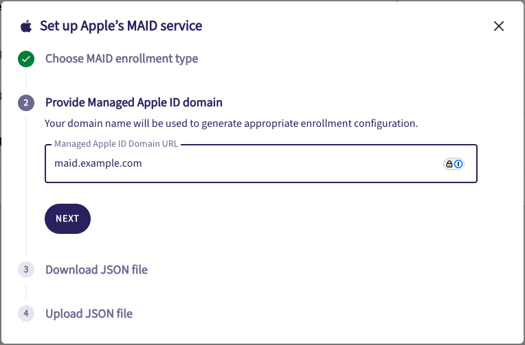 In step 2, enter the web domain associated with your MAID service, then select NEXT to continue: