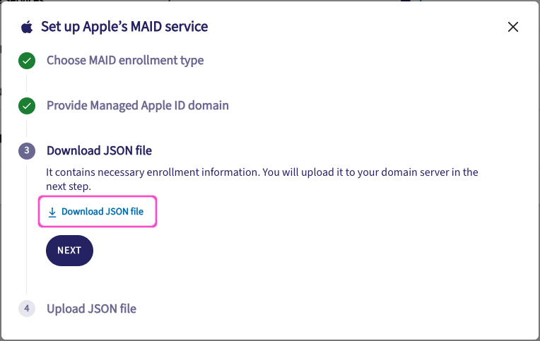 In step 3, download the enrollment JSON file using the link provided. Select NEXT to continue: