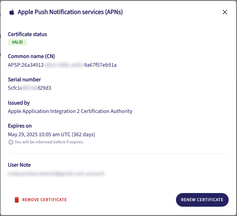 The Apple Push Notification services (APNs) dialog accessed through the View action provides details for the current certificate: