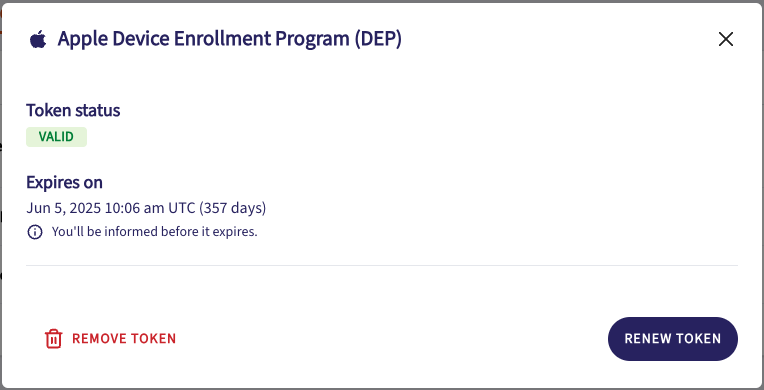 REMOVE TOKEN: Deletes the current connection and removes all DEP-enrolled iOS and iPadOS devices from Coro MDM.