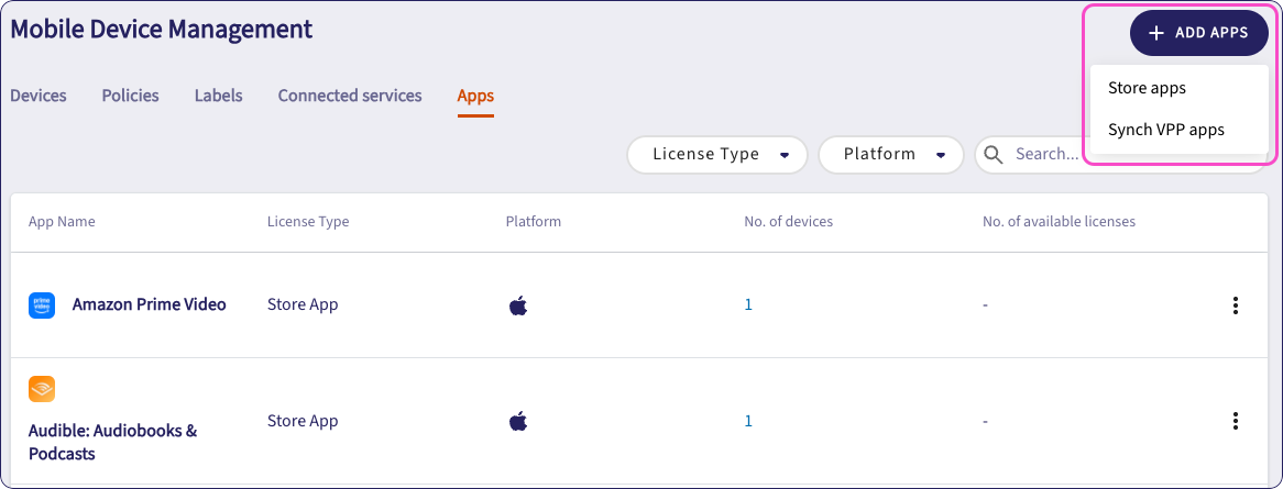 Filter the app list by License type and Platform.