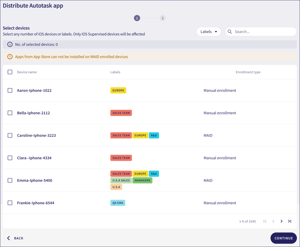 - Filtering by device label to select all devices with a particular label.