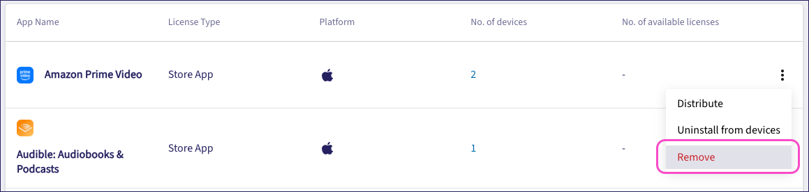 To remove an app from the managed apps list: