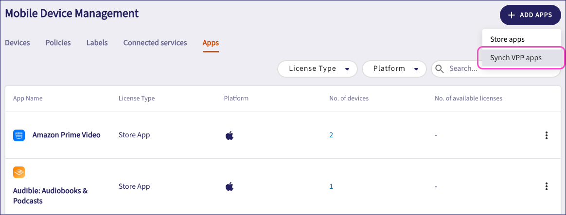 To synchronize the app list with your VPP service, select + ADD APPS > Synch VPP apps: