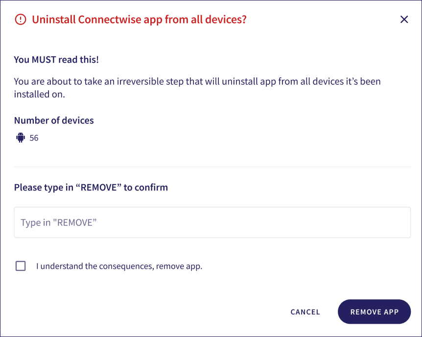 Type REMOVE in the box provided, then select I understand the consequences, remove app..