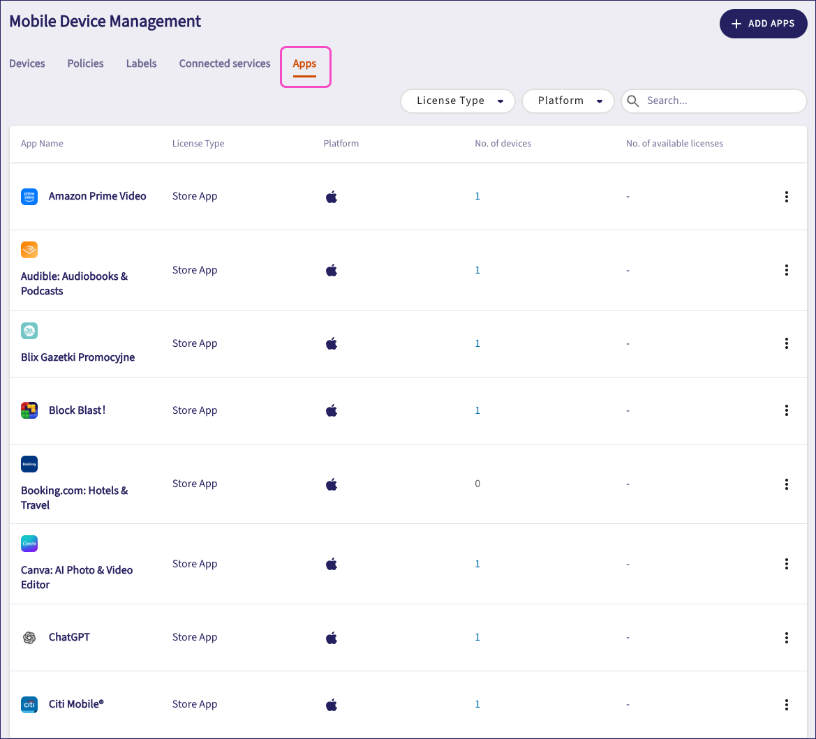 From the Mobile Device Management page, select the Apps tab: