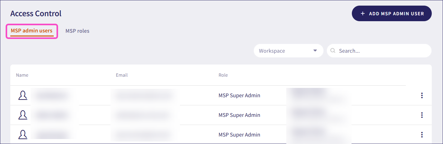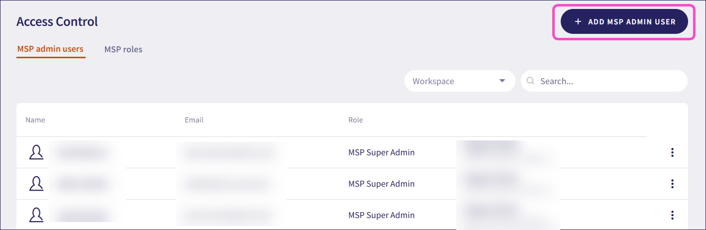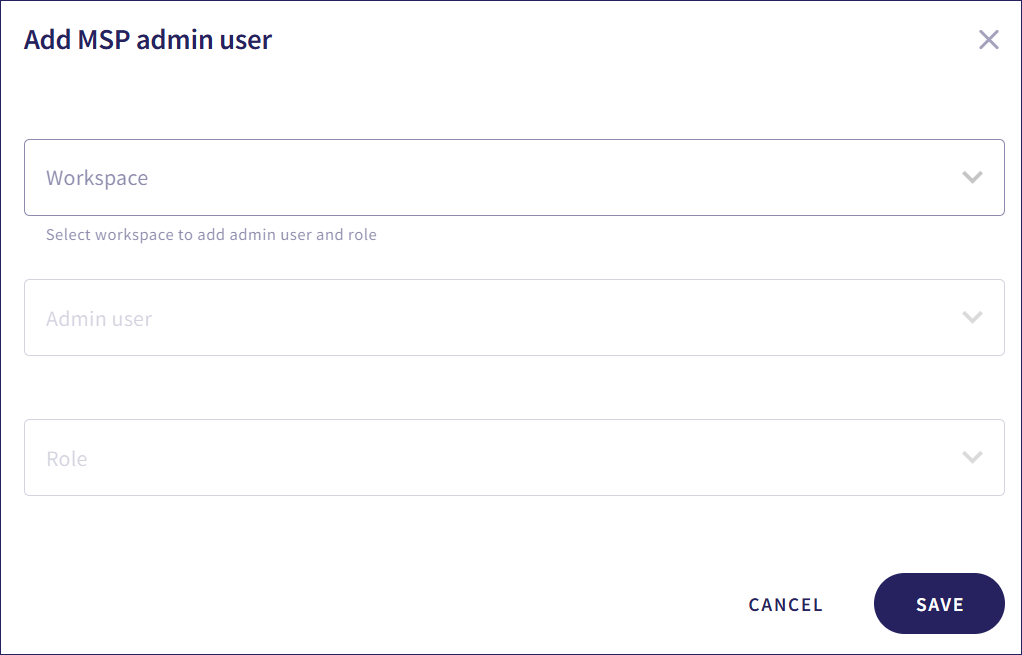 Select an existing admin user from the workspace to upgrade to an MSP admin user. To add a new admin user to a workspace, see adding a new admin user.