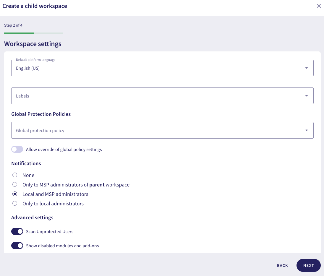 - Only to MSP administrators of parent workspace: Send notifications to MSP admin users of the parent workspace.