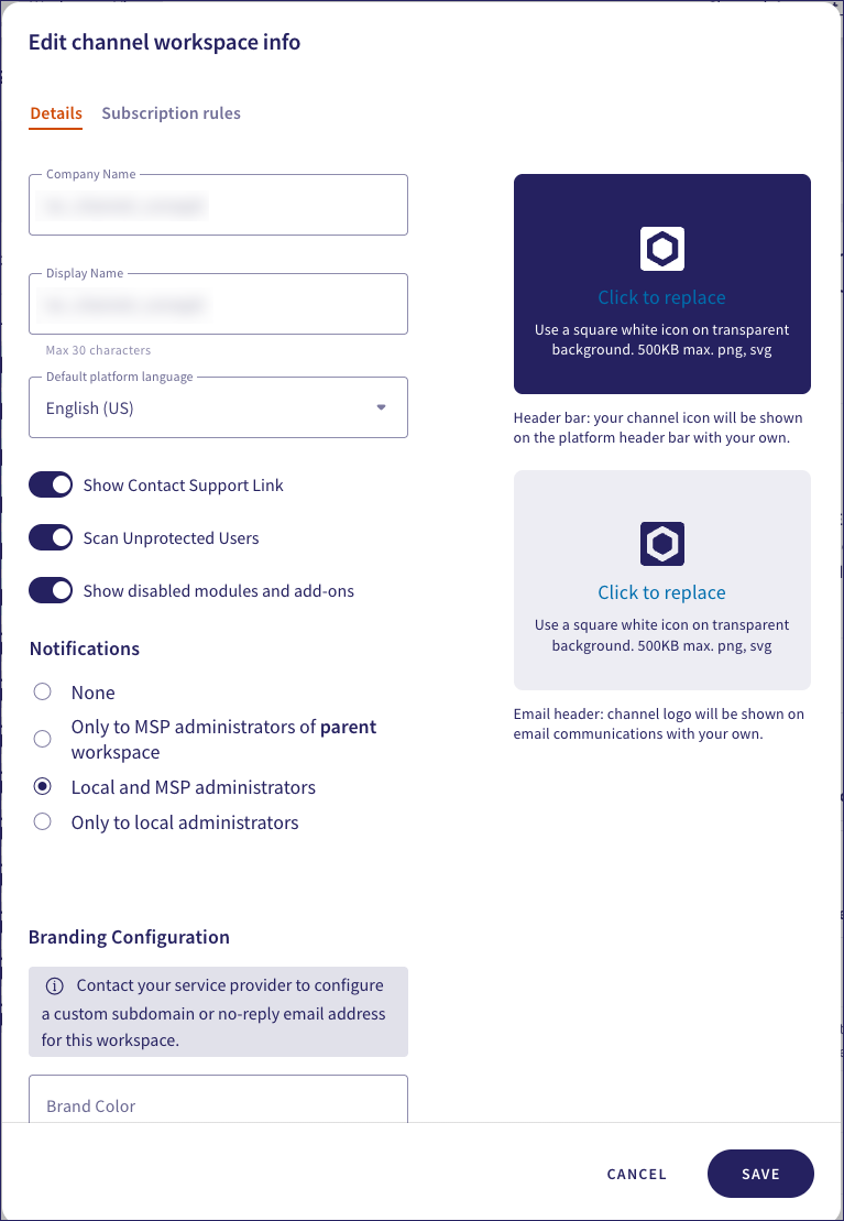 Managed Service Provider (MSP) admin users can edit the details for any existing workspace within the MSP hierarchy for which they have access.