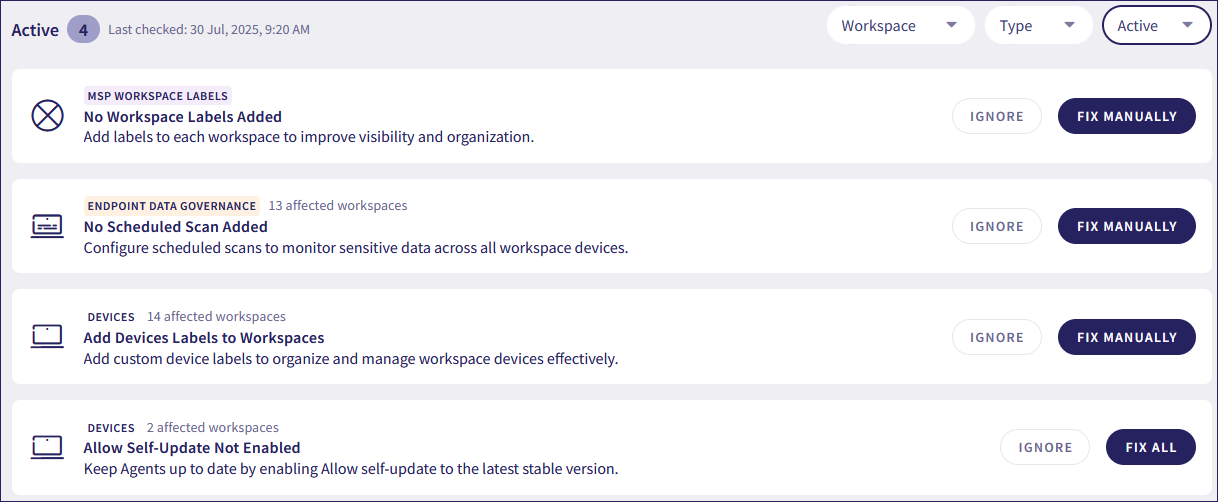 Global security gaps includes gaps from parent and descendant workspaces. For other details and actions, see Security gaps.