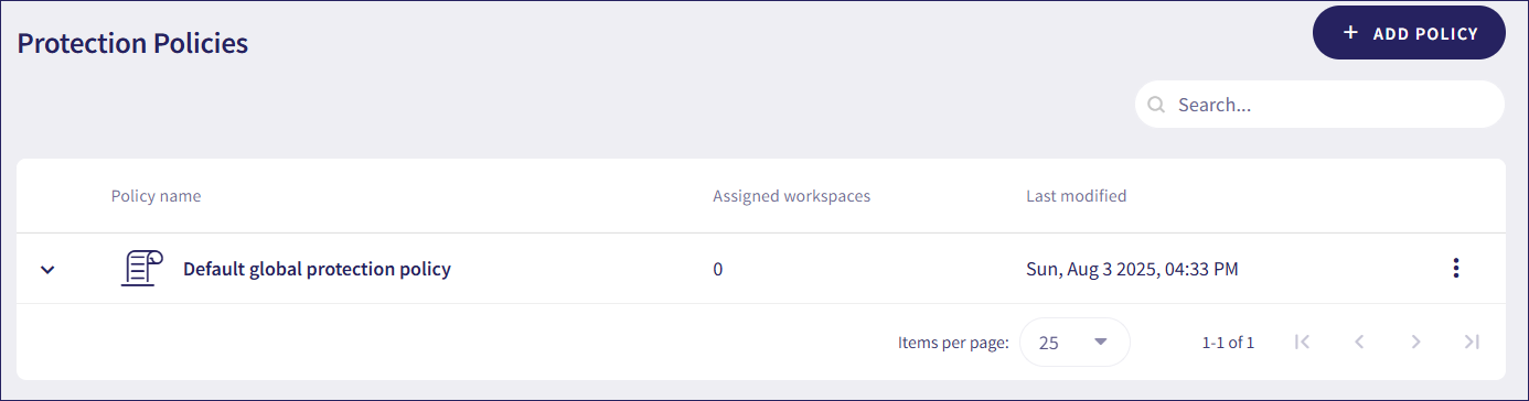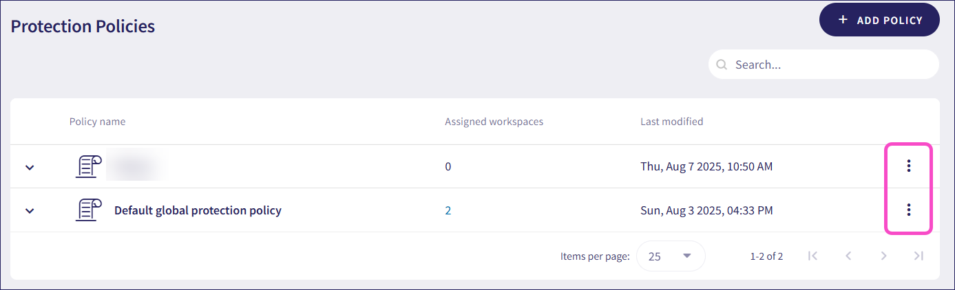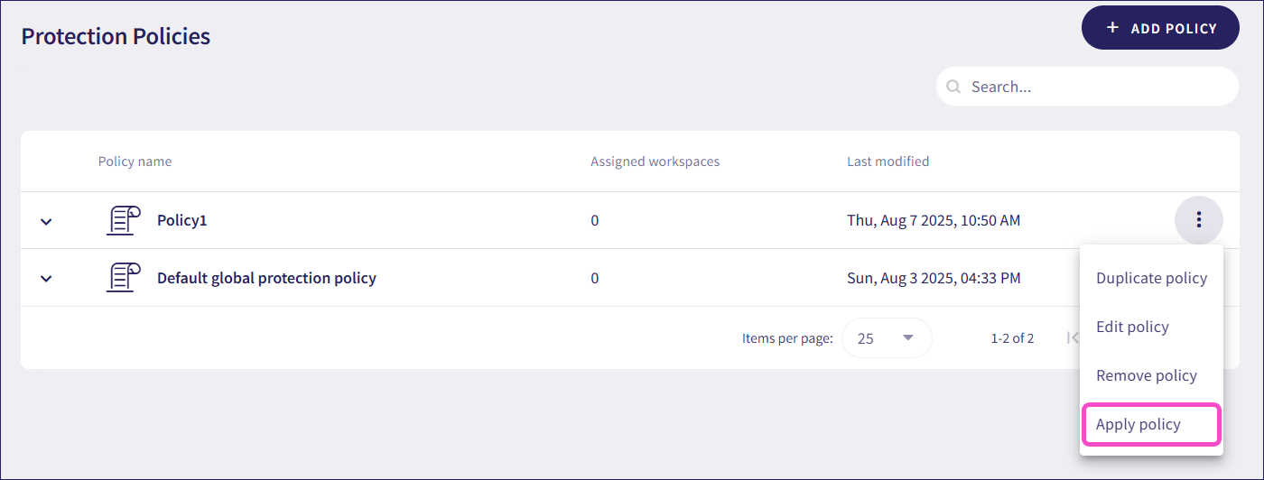 You can duplicate, apply to workspaces, and view the default protection policy from its three-dot menu. You cannot edit or remove it.