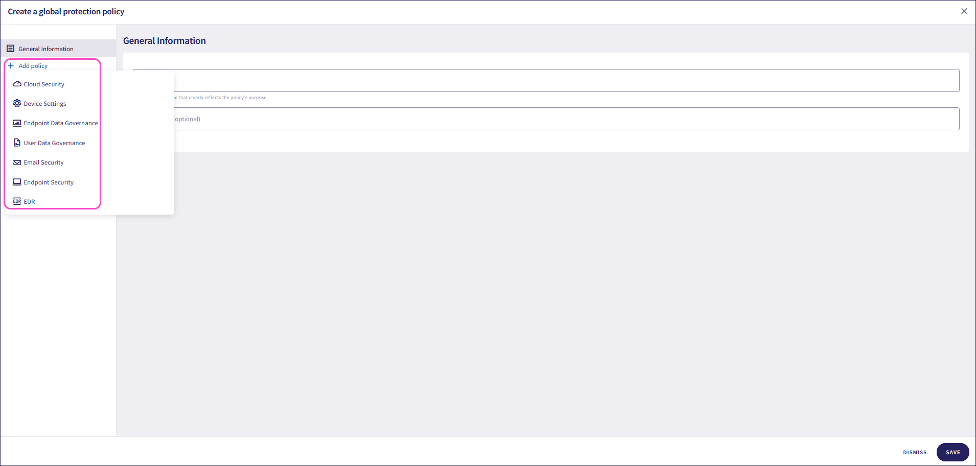 In the General Information section, add a name and description for the policy: