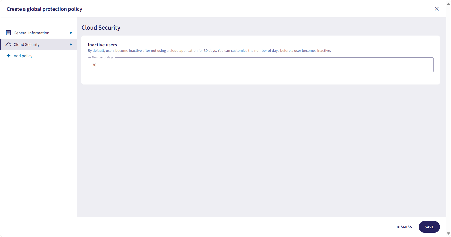 If you add the Cloud Security section, set the number of days after which a user becomes inactive when not using a cloud application: