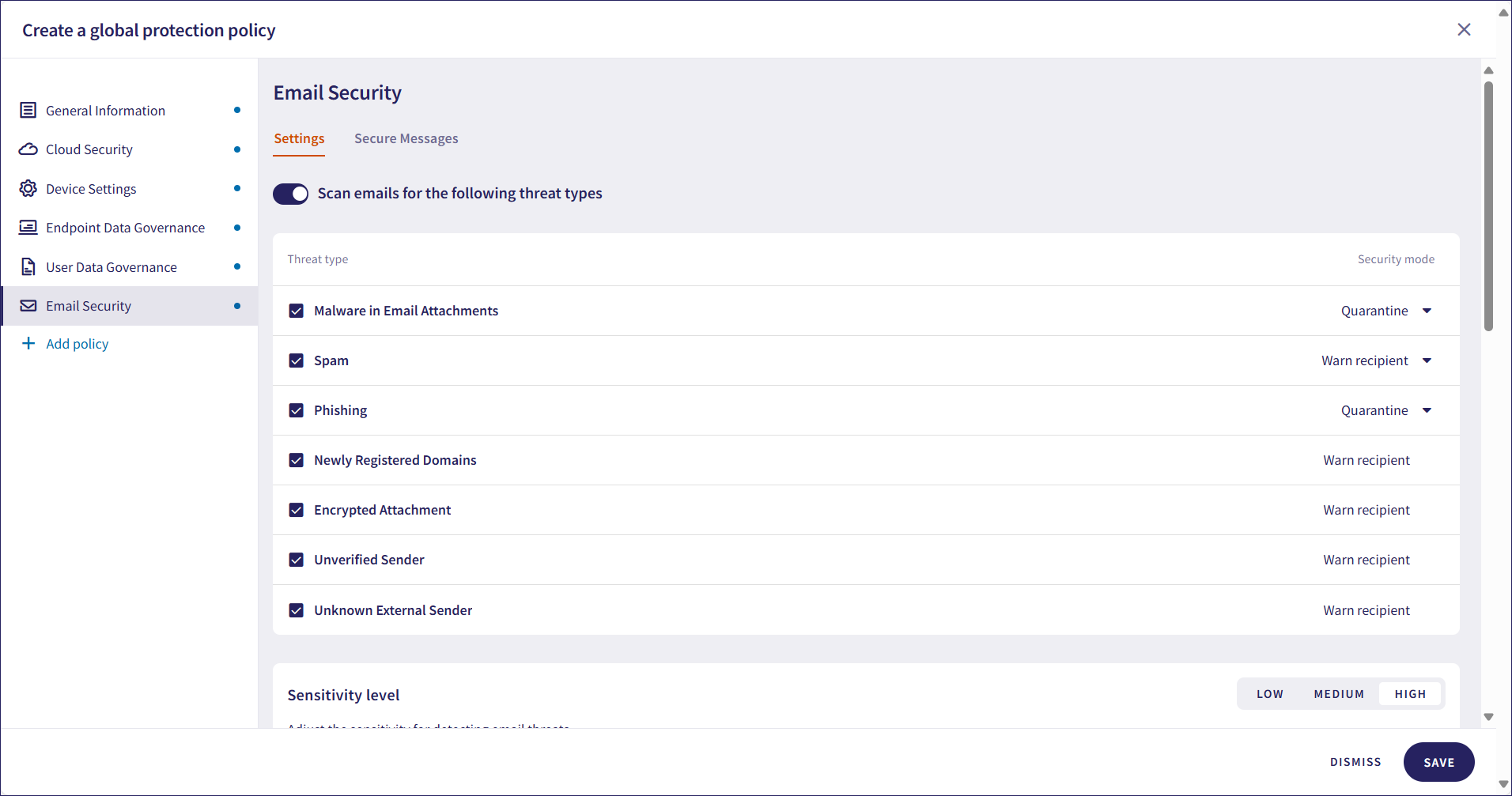 - Select the sensitivity level for detecting email threats