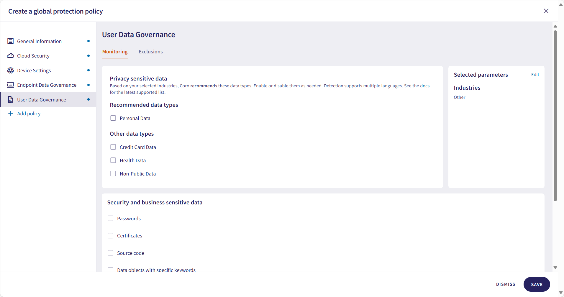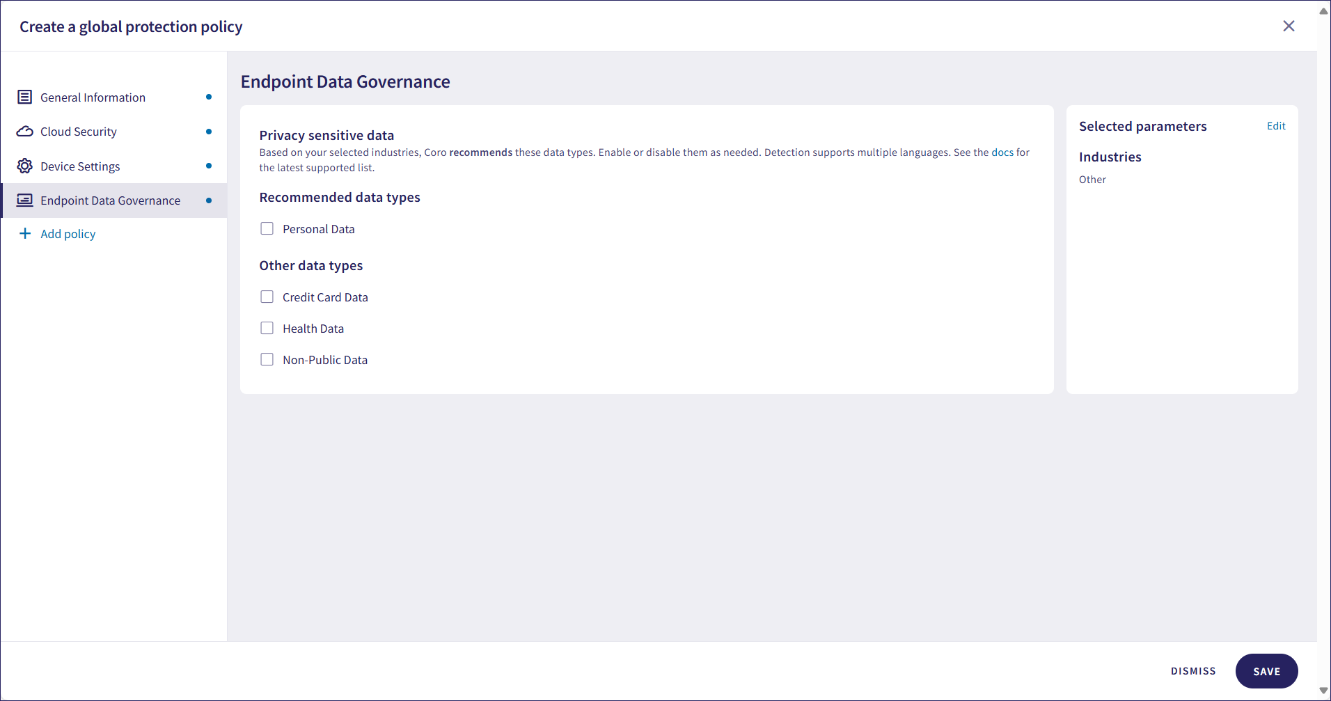 If you add the Endpoint Data Governance section, select privacy sensitive data types for monitoring: