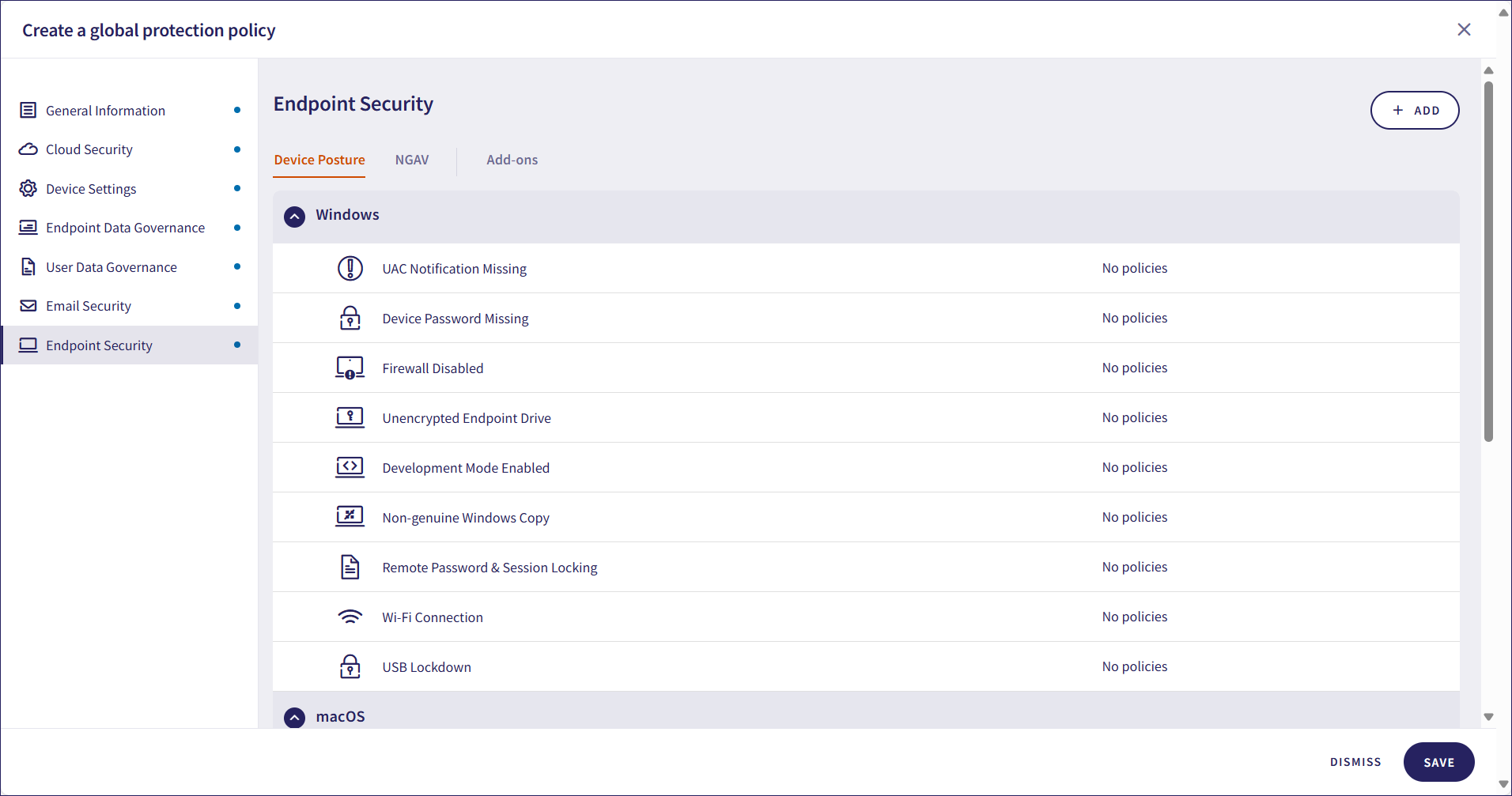 Select Add policy, then choose the sections where you want to apply global protection policies. These sections include: